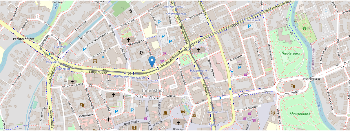 Parkmöglichkeiten an der „Markthalle“, im Parkhaus „Welfenhof“, im Parkhaus „Astor-Filmtheater“ sind in unmittelbarer Nähe.